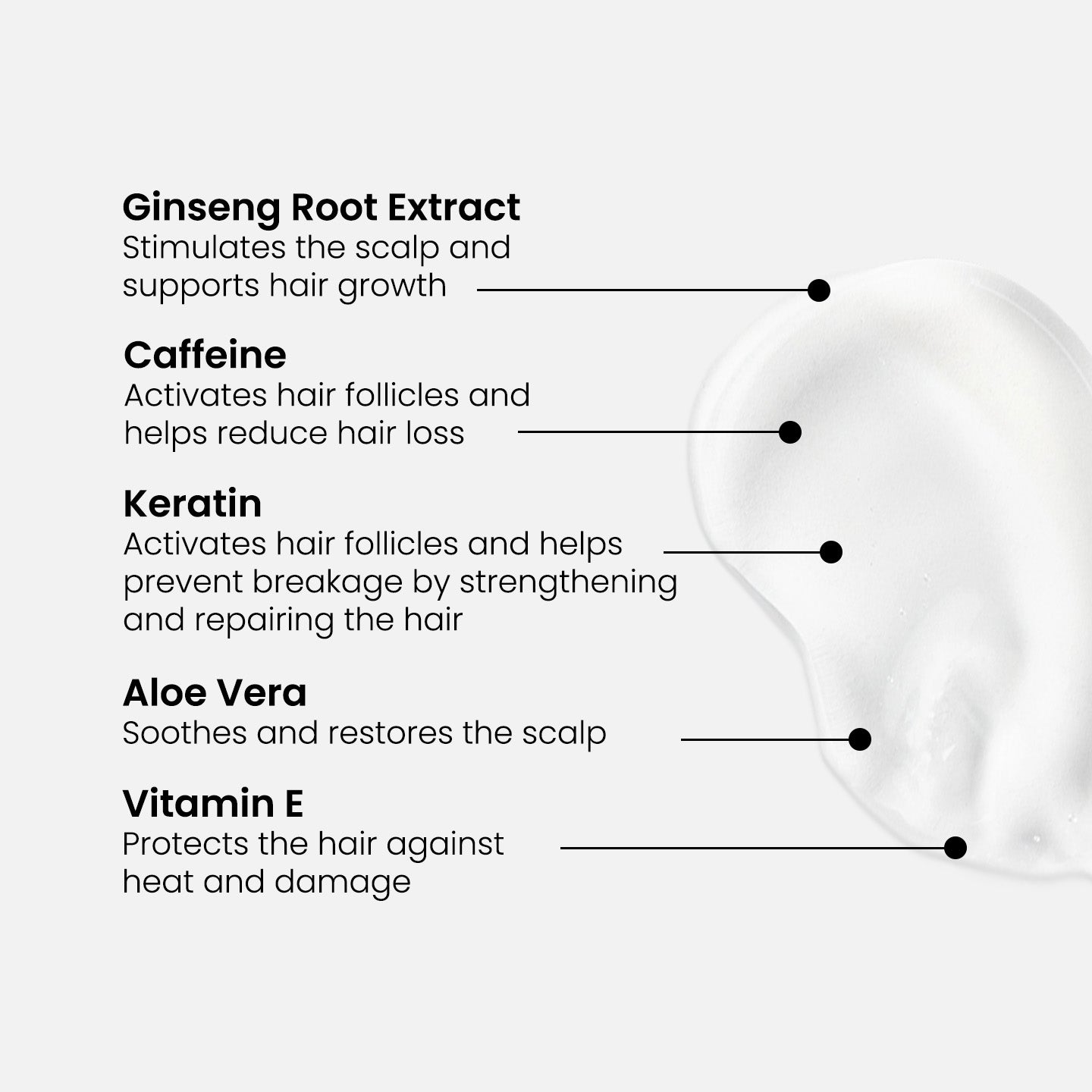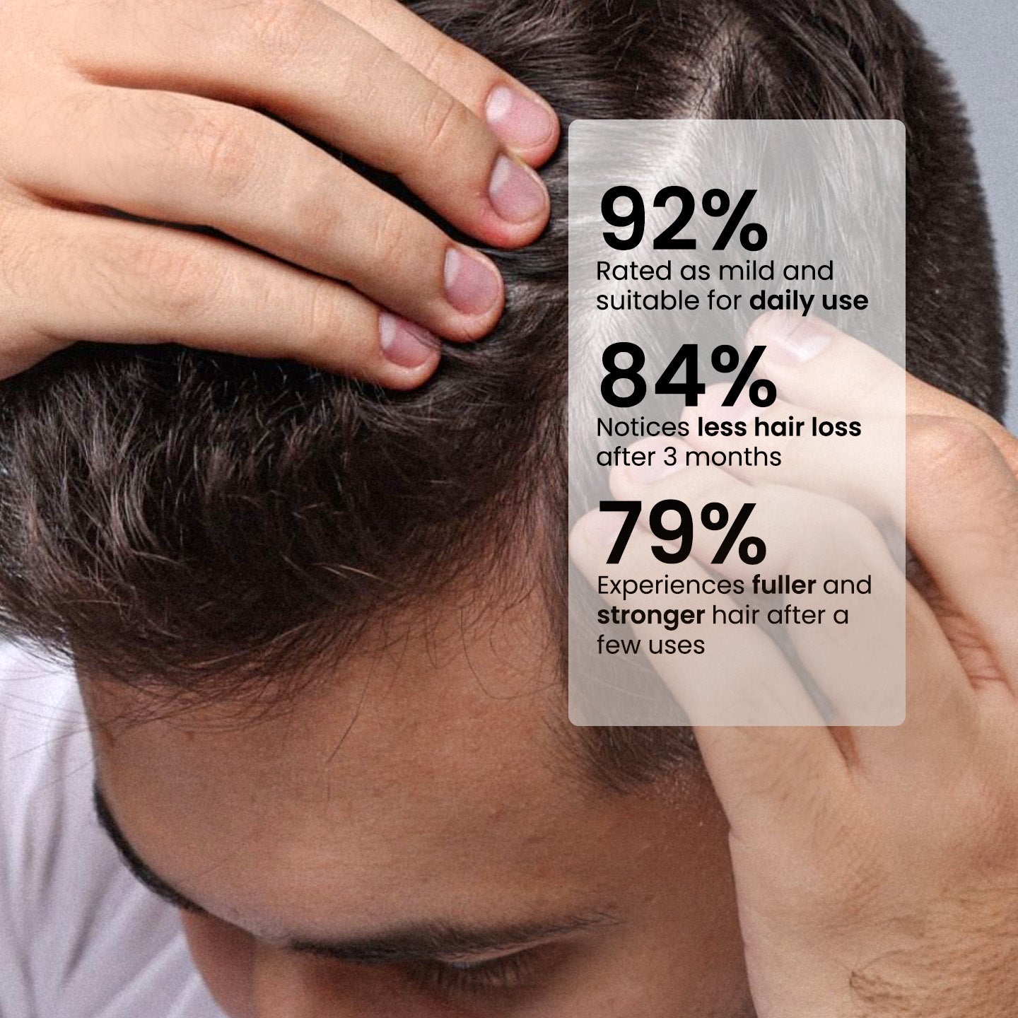 The Anti-Hair Loss Shampoo contains many active ingredients to combat hair loss and stimulate hair growth. A good example of such an ingredient is Caffeine. Studies have shown that caffeine stimulates hair follicles, slows hair loss and promotes hair growth by improving blood flow to the scalp. It also protects hair follicles from the negative influence of the hormone DHT, which is known to be a major cause of hair loss in both men and women.