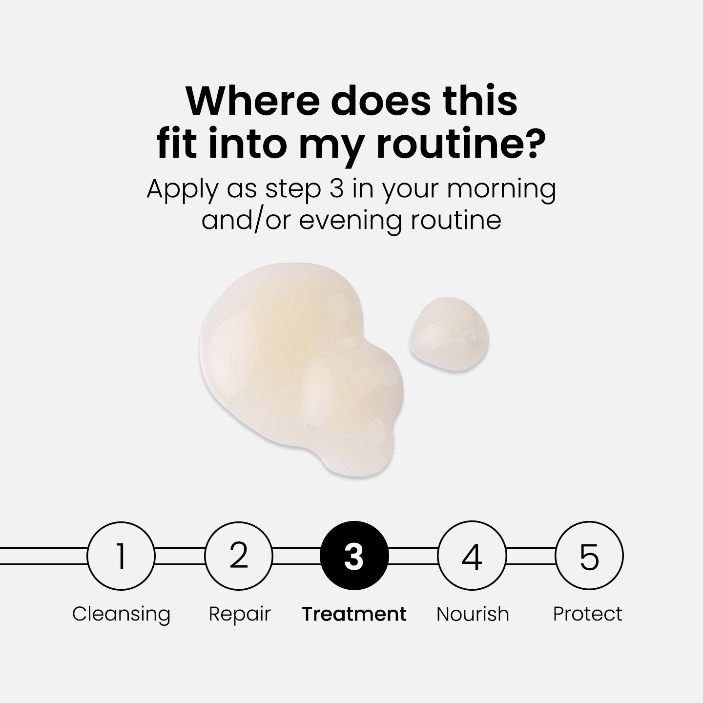 Apply the serum to your palm and gently massage into the face and neck using upward motions until fully absorbed. Suitable for daily use. Always follow with SPF 30 or higher during the day.