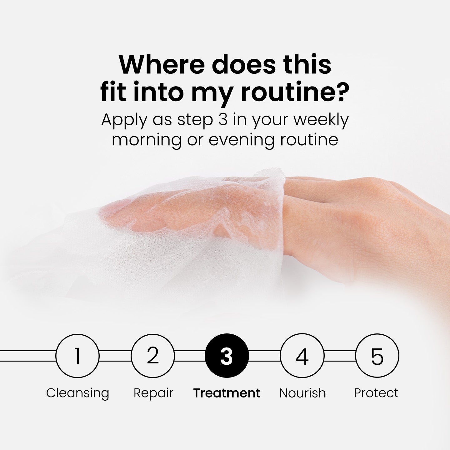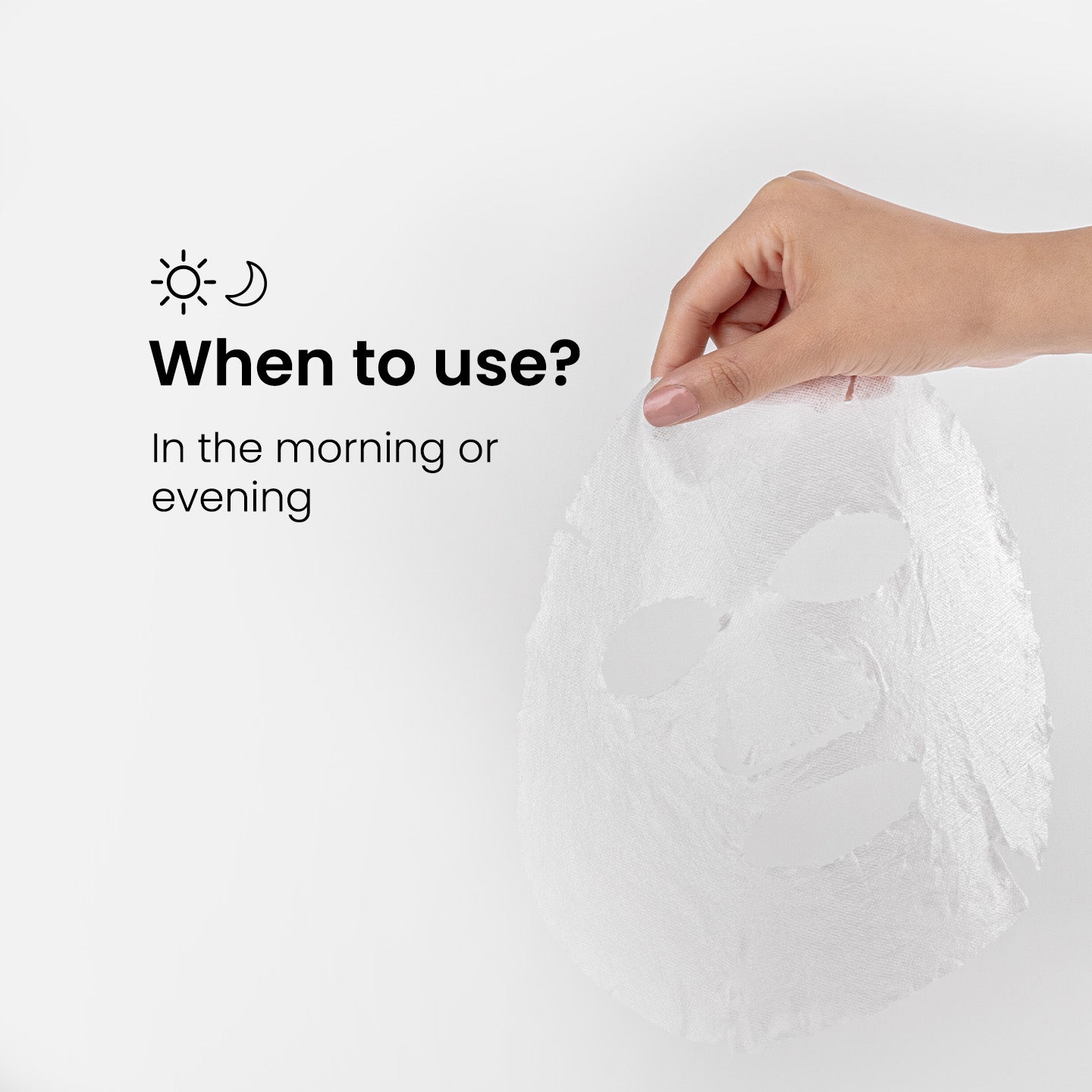 Directions for use: apply the mask starting from your forehead and position the holes for your eyes, nose and mouth. Remove the foil and smooth the mask with your fingers. Let it sit for 15-20 minutes. You can apply the excess serum in the container to other (dry) areas of your skin or save it for the next day. Do this about twice a week.