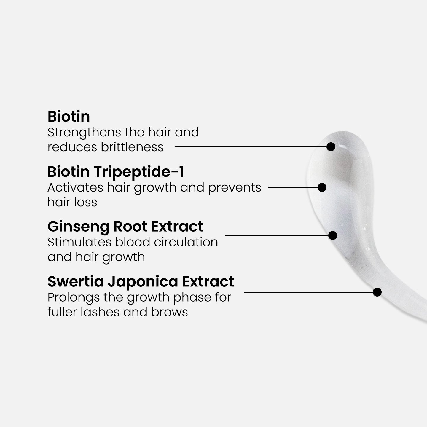Aqua, Glycerin, Butylene Glycol, Calendula Officinalis Flower Extract, Panax Ginseng Root Extract, Serenoa Serrulata Fruit Extract, Camellia Oleifera Leaf Extract, Wheat Protein, Disodium Phosphate, Biotin, Cellulose Gum, Phosphoric Acid, Swertia Japonica Extract, Trifluorostroethylamide, Biotin Tripeptide-1, Octapeptide-2, Pentylene Glycol , Phenoxyethanol, Chlorphenesin