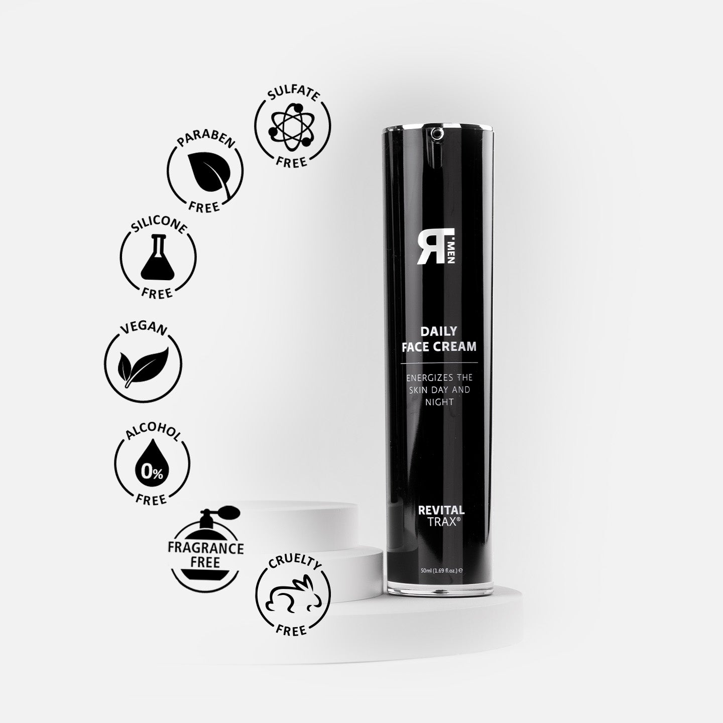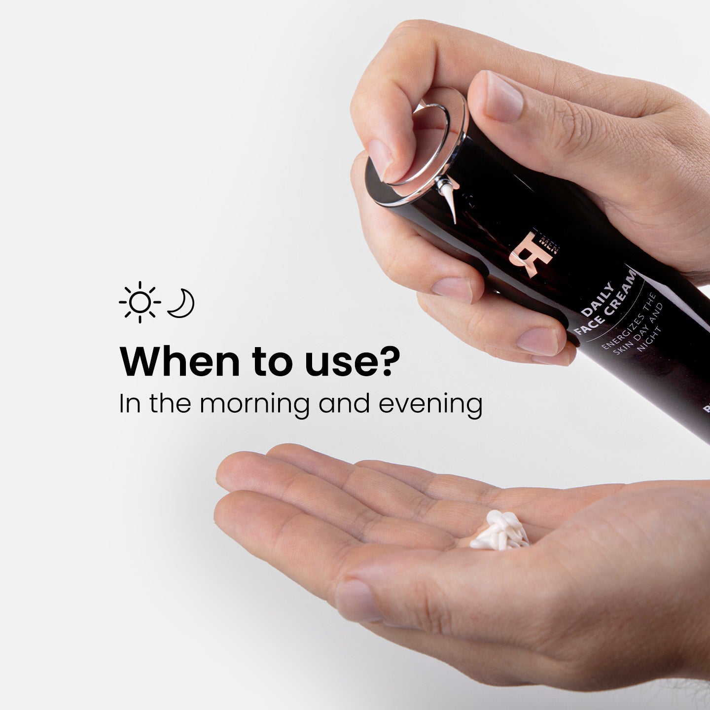 Apply an appropriate amount of the cream to your fingertips and gently massage onto your face and neck. For best results, use the Daily Face Cream in both the morning and evening. To do so, use the Daily Face Wash for Men and the Daily Face Lotion for Men.