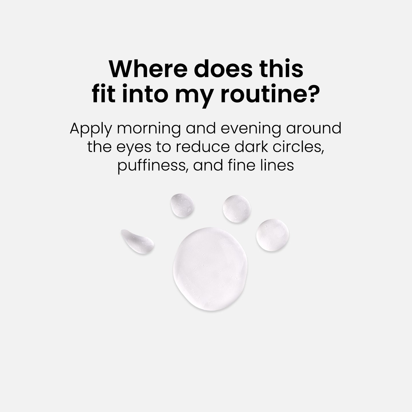 Apply the serum to clean, dry skin. Gently press the cap to release a small amount of product through the roll-on applicator. Roll it softly under the eyes from the inner to the outer corner. If desired, follow up by tapping with your fingertips until fully absorbed. Avoid direct contact with the eyes.
