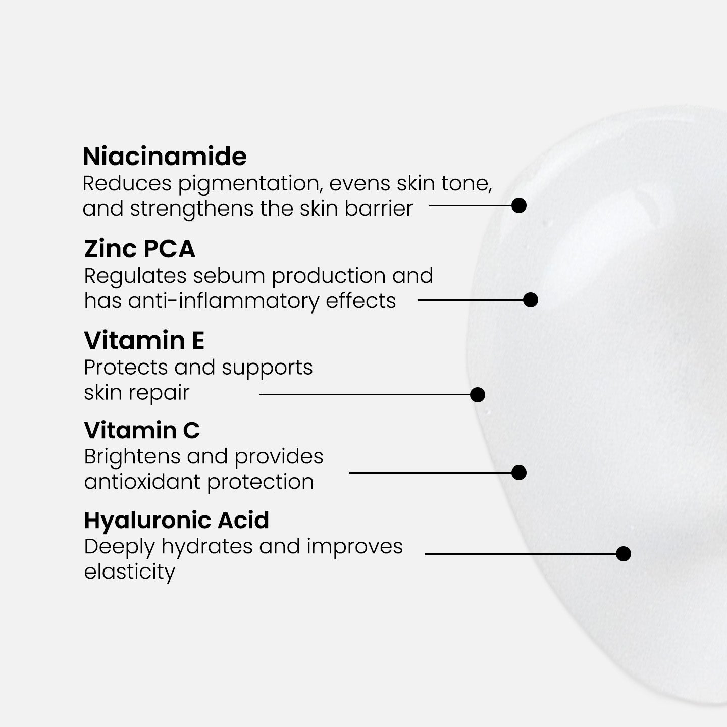 Its key ingredient, niacinamide (vitamin B3), helps reduce hyperpigmentation by regulating melanin production, which fades pigmentation spots and evens out the complexion. It also strengthens the skin barrier, improving the skin's ability to retain moisture and protect itself from harmful environmental factors.