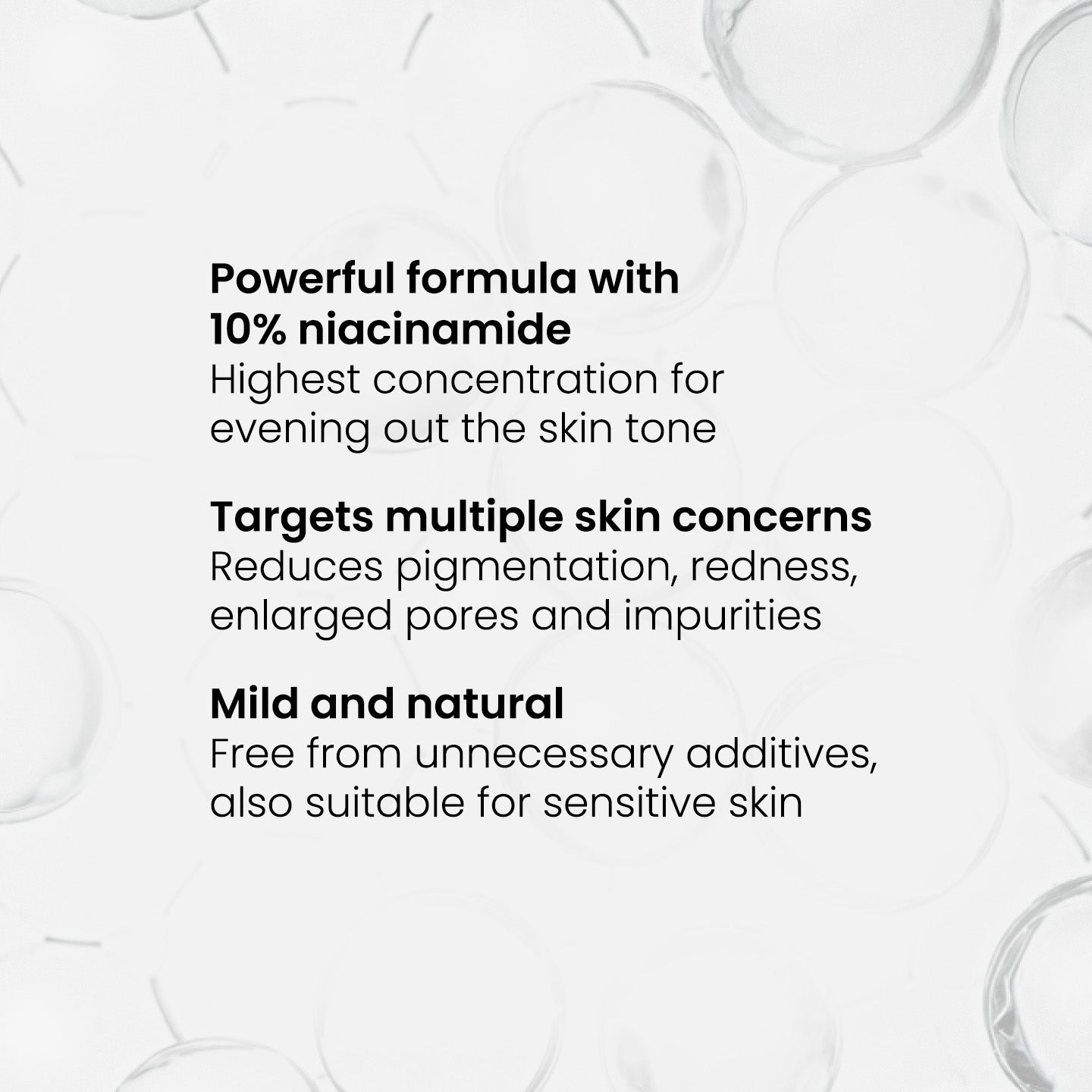 The 10% Niacinamide Serum is specially formulated to effectively reduce stubborn spots and discoloration. The powerful formula works deep into the skin to fade pigmentation, even out complexion and calm redness. Enriched with 1% zinc and other nourishing ingredients, it refines pores, regulates sebum production and supports healthy, balanced skin.