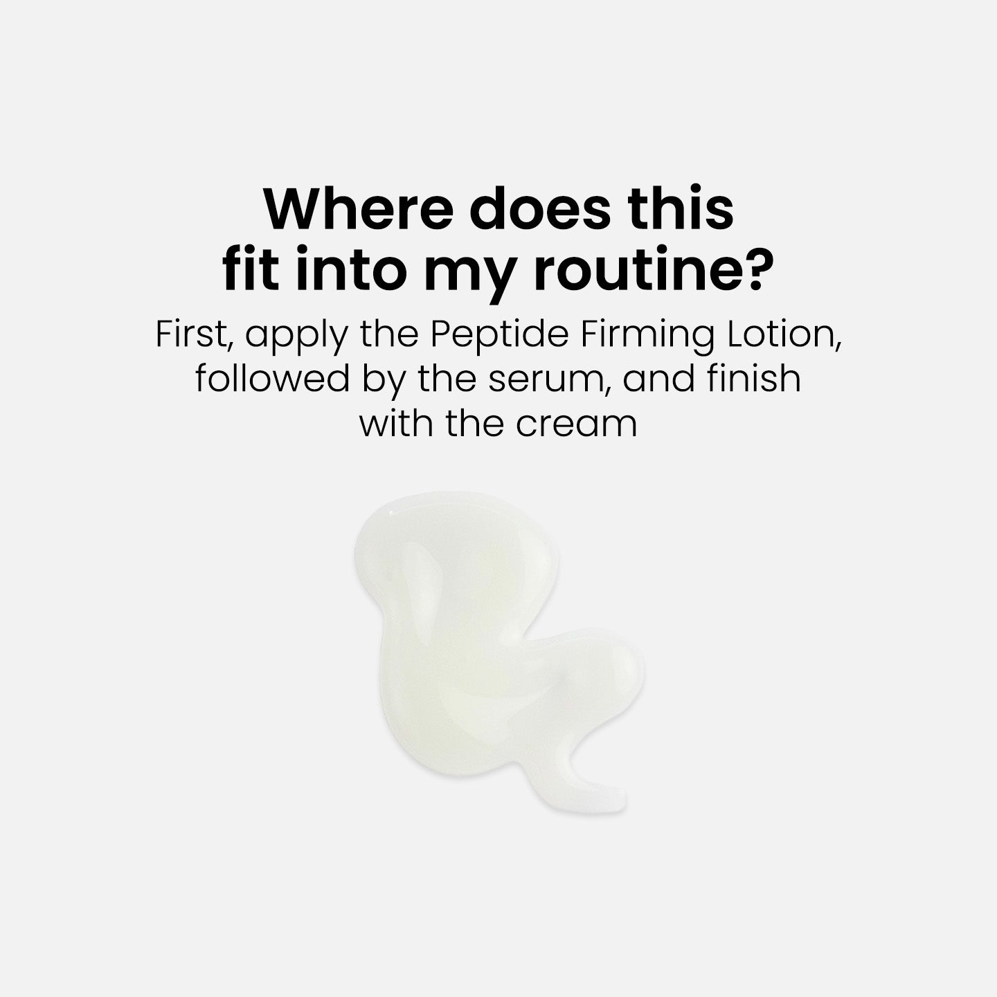 - After cleansing your skin, apply the Peptide Lotion to your neck and décolleté until absorbed. It helps restore your skin's pH level and allows for better absorption of subsequent products.