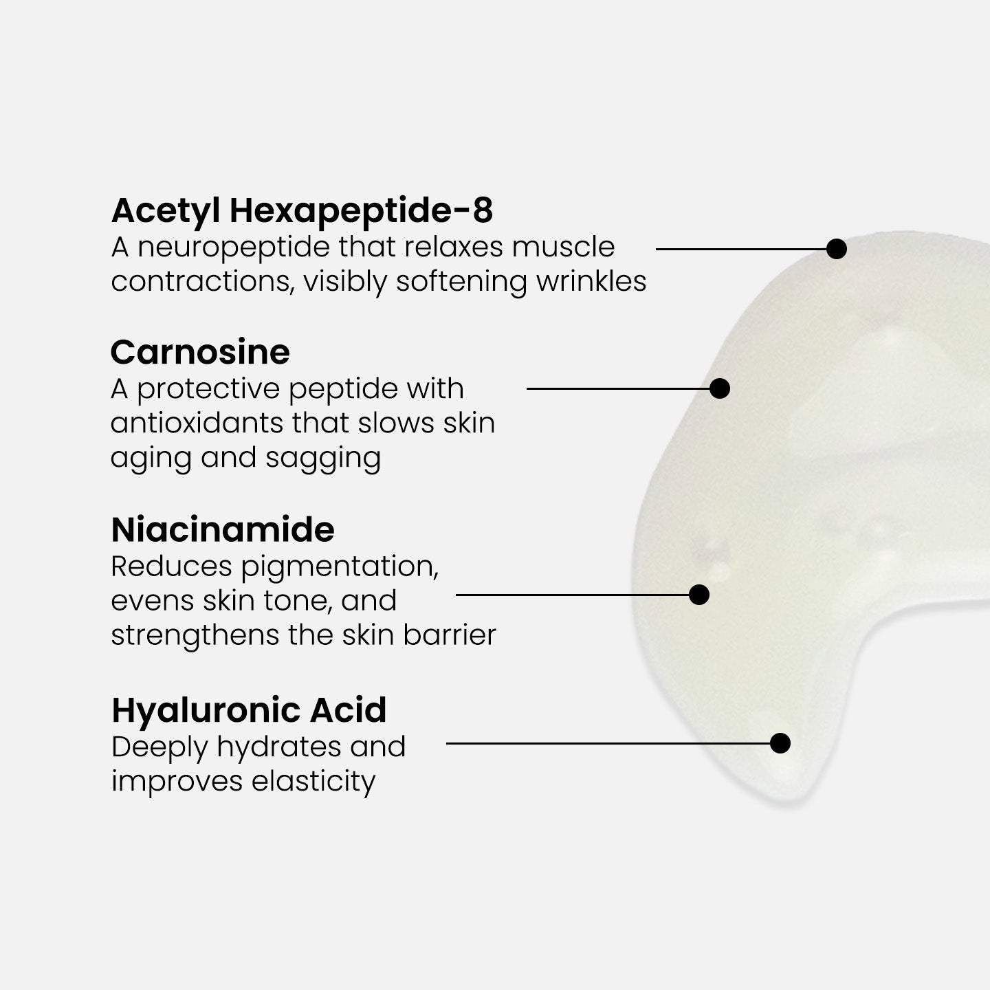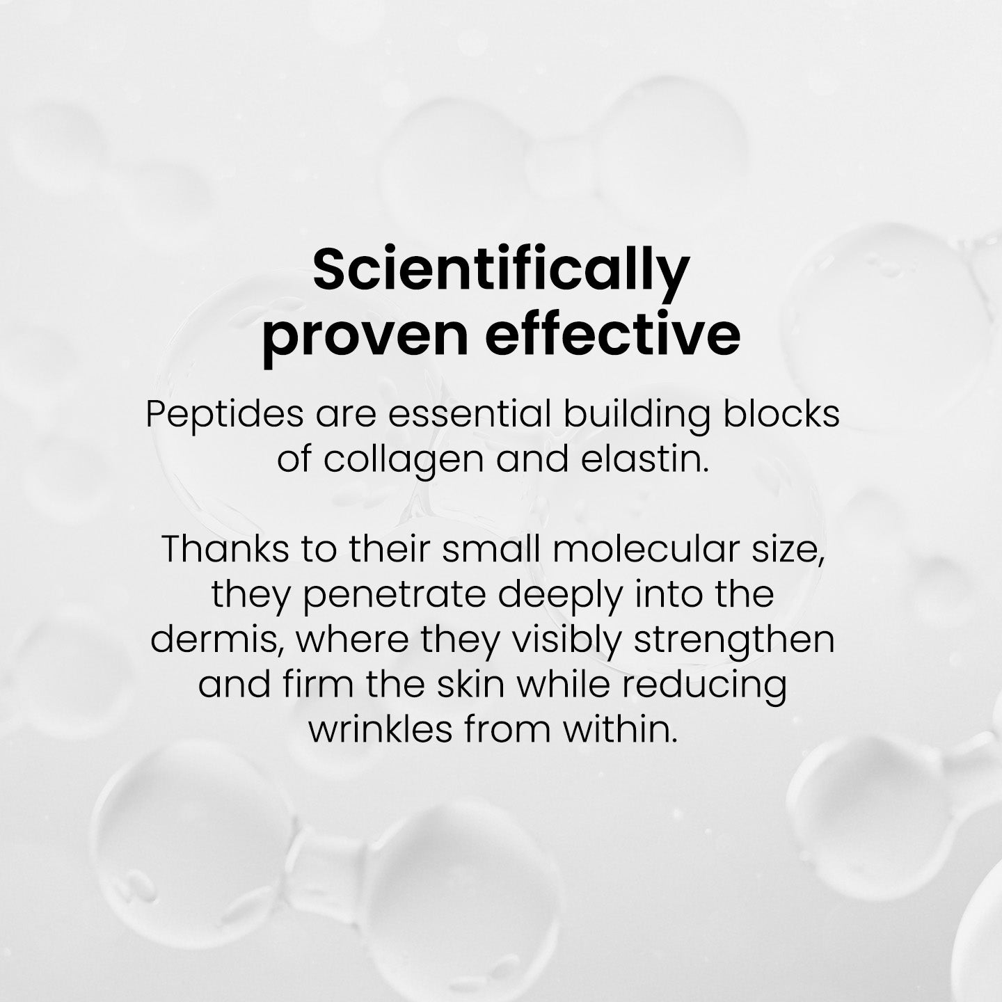 Peptides are one of the most effective active ingredients available for re-tightening the skin and reducing wrinkles. This is because they are essential building blocks of proteins in our bodies, such as collagen and elastin, which are crucial for skin firmness and elasticity.