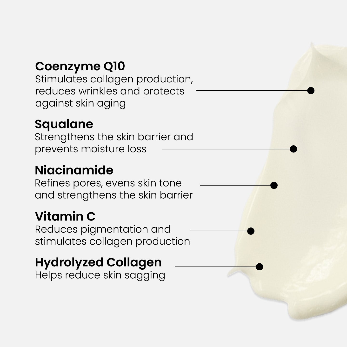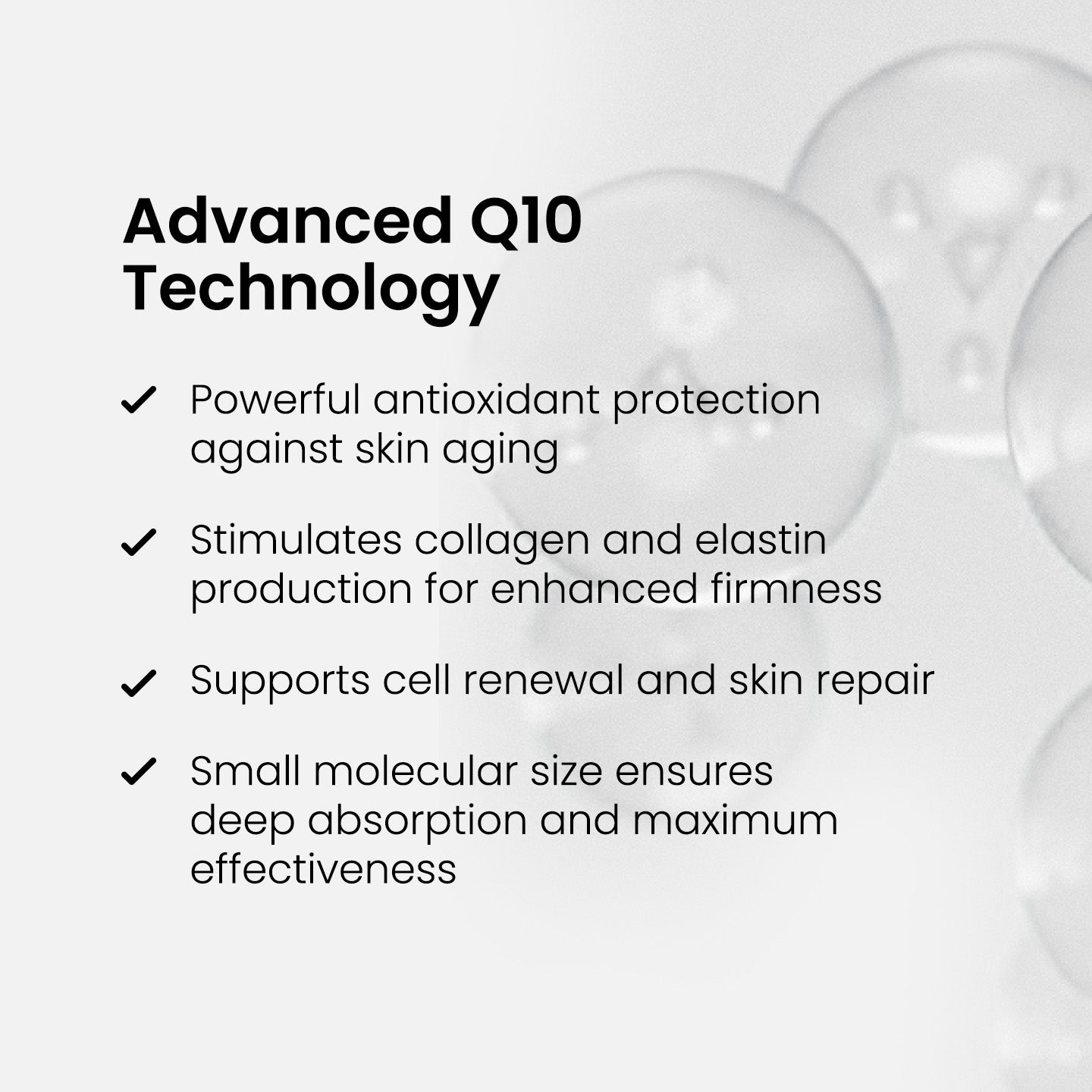 - Q10 stimulates collagen production and gives the skin a boost in cell renewal and repair.